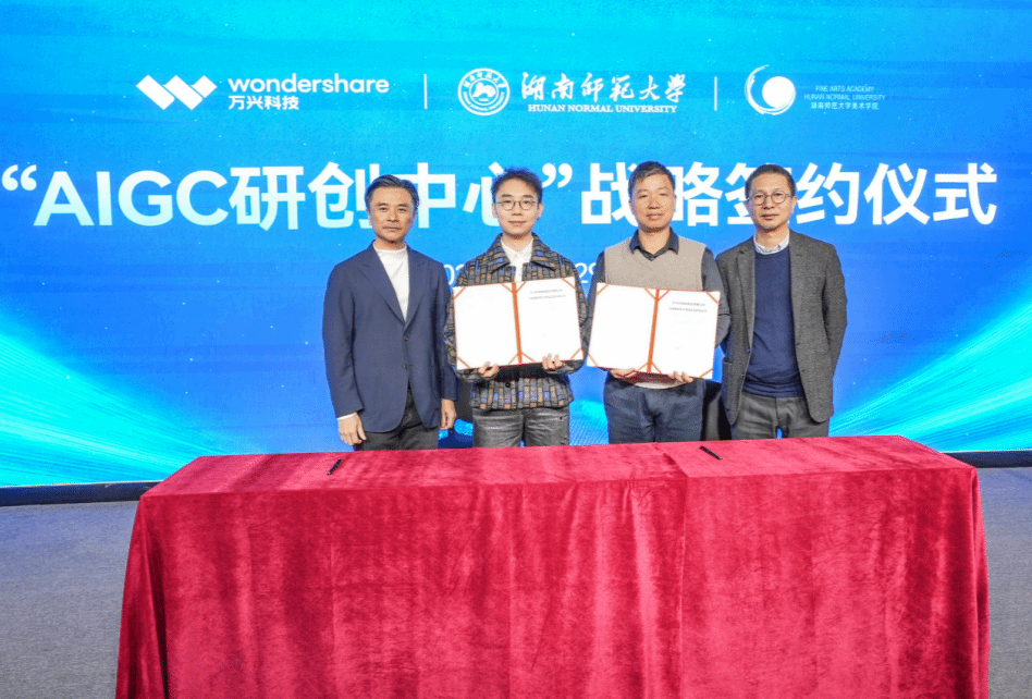 在全场嘉宾的见证下,双方代表签署战略合作协议并共同揭牌。此次签约与揭牌,是湖南师范大学美术学院与万兴科技积极响应国家“人工智能+”行动计划,深入推进“AI+艺术”融合的重要一步。AIGC研创中心的成立标志着校企合作进入实质性推进阶段。这一平台将突破传统艺术教育的边界,通过课程共建、项目共研、成果共享的创新机制,打造产学研用一体化的示范样本。未来,AIGC研创中心将深度融合湖南师大美院的艺术底蕴与人才储备,持续汇聚万兴科技的产业资源与技术优势,共同开展AIGC技术在艺术创作、设计应用等领域的创新探索,为推动数字创意产业发展和艺术教育变革注入持久动力。