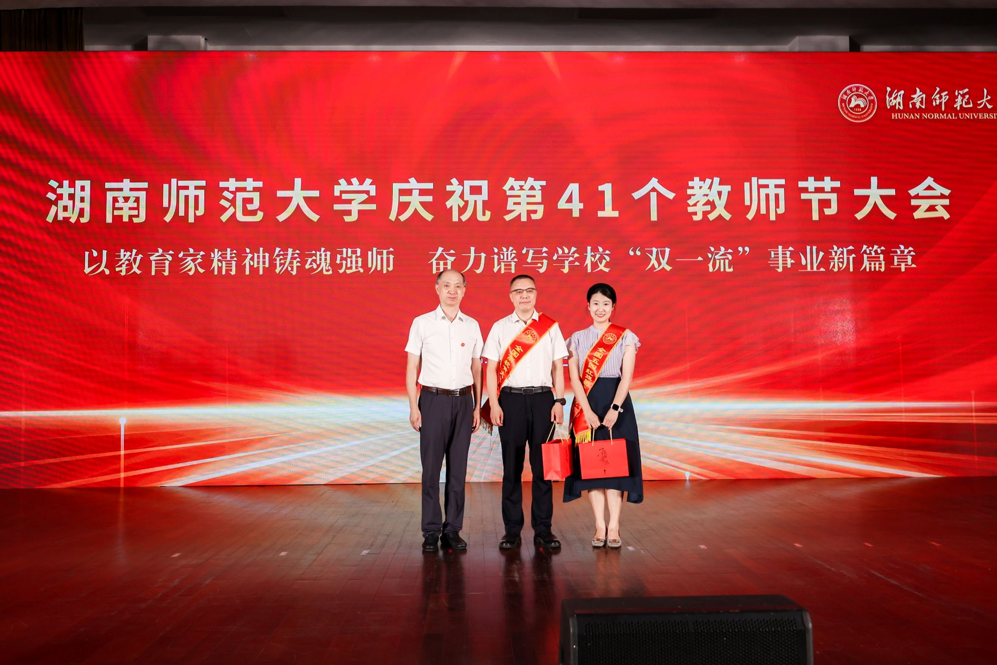 刘仲华向全体教职工致以节日的问候和祝福,向荣休教职工致以崇高的敬意,向新入职教职工表示热烈的欢迎,祝贺获奖代表和晋升高级职称的老师们,并对全体教职工为学校建设发展作出的贡献表示感谢。他强调,要贯彻落实习近平总书记在全国教育大会上的重要讲话精神,准确把握新时代高等教育发展的新形势新要求,切实增强办好人民满意教育的责任感和使命感。一是要弘扬教育家精神,筑牢立德树人之魂,恪守“为党育人、为国育才”的初心使命,树牢“学高为师、身正为范”的职业追求;二是要拥抱时代发展大势,担当教育强国使命,以更高的站位、更宽的视野、更大的魄力推进“双一流”建设,为加快建设教育强国贡献更多的师大力量;三是要谱写事业发展新篇,共创师大美好未来,以“十五五”规划编制为着力点,科学规划学校中长期发展规划,提升学校核心竞争力。他希望全体教职工积极拥抱新技术,迎接新挑战,瞄准世界科技前沿和国家战略需求推进科研创新,不断提升自身综合素养,为学校发展贡献自身力量,共创师大美好未来。