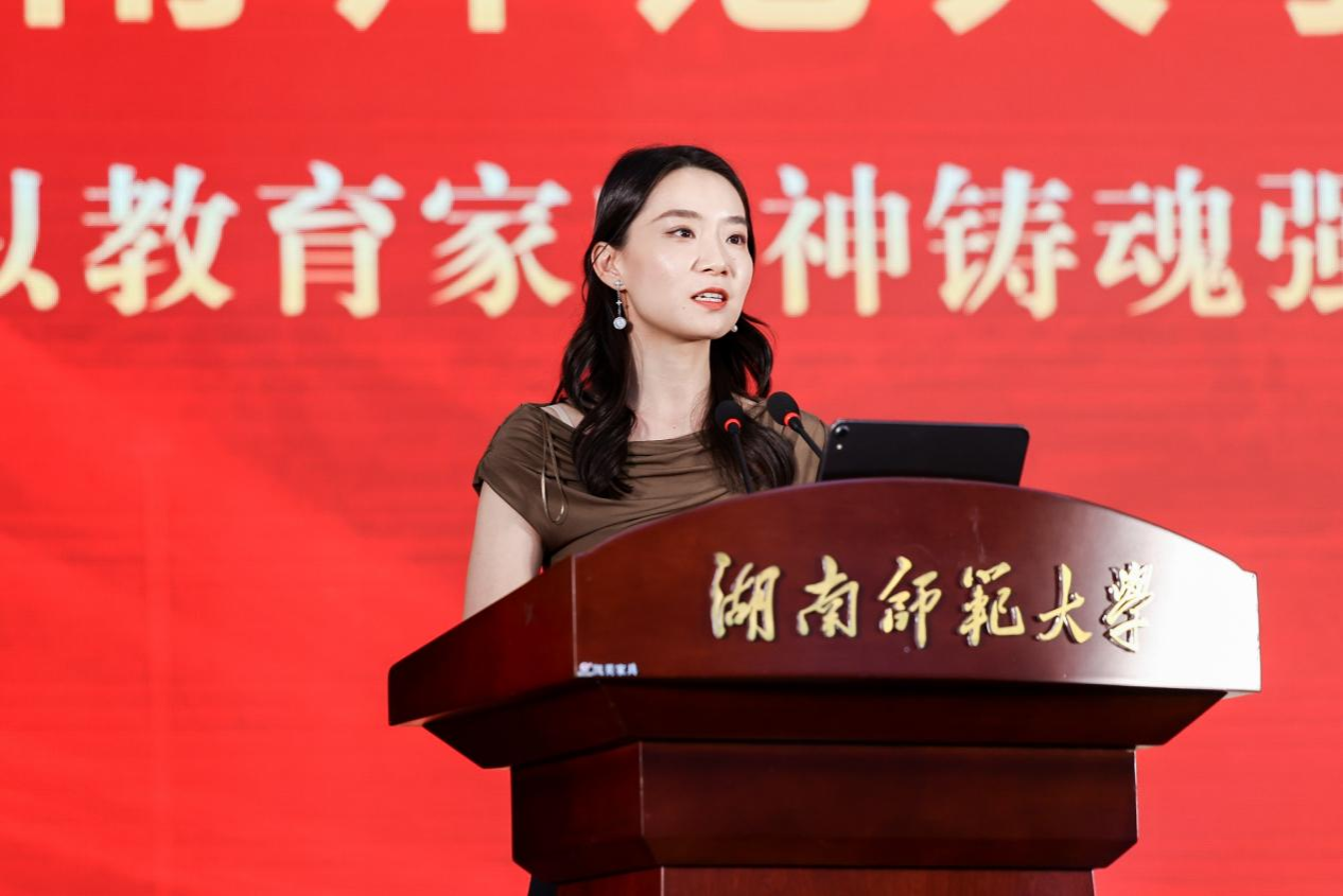 教职工代表、音乐学院新进教师王艺璇博士发言。她为能够加入湖南师范大学感到骄傲和幸福,并分享了自己的感悟:一是要持续精进学业,做学习的笃行者;二是要矢志修身养德,做学生的引路人;三是要扎根艺术实践,做时代的歌唱者。她承诺将以热忱之心投身教学科研,以创新之心拥抱时代变革,传承学校优良传统,为学校发展贡献自己的力量。
